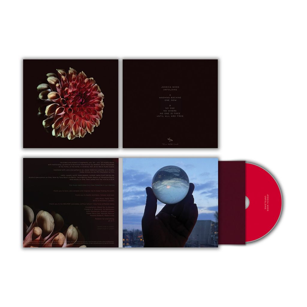 Working closely with producer Radwan Ghazi Moumneh (Jerusalem In My Heart), Moss notes "Unfolding was made slowly, over the last 12 months, the second full year of genocide in Palestine, in direct response to our collective witnessing, our collective grief, as a portal to collective mourning, as a searchlight through our internal weather systems, seeking one another out in the dark." The inseparability of the personal and political has wrung ever tighter for Moss these past two years, as for so many. She’s co-organized and played several benefit shows as a core member of the Montréal chapter of Musicians For Palestine, and she released the solo album For UNRWA in spring 2024 (garnering over 800 supporters and raising thousands of dollars).
