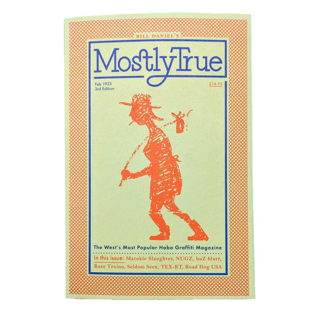 In Texas in the early 1900s, a little chalk drawing started to appear on boxcars: a minimalist sketch of a figure with a 10-gallon hat, smoking a pipe, signed “Bozo Texino.” This famous railroad tag defied the human lifespan, appearing over 100,000 times over 90 years. Who was Bozo Texino? Artist and filmmaker Bill Daniel set out to solve the mystery of the man behind the pipe and hat. It turned into a 25-year quest, taking Daniel on a tour of railyards and graffiti throughout the US. The result was the documentary Who is Bozo Texino? and the book Mostly True—a chronicle of modern-day hobos, rail workers, and a forgotten outsider subculture. Obscure railroad nostalgia, freight-riding stories, interviews with hobos and boxcar artists, historical oddities, and tons of photos of modern-day boxcar tags are all presented in the guise of a vintage rail fanzine.