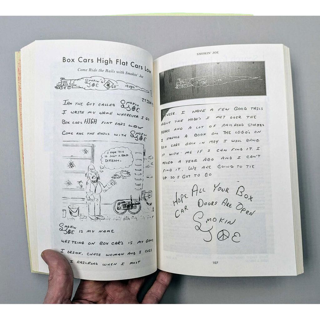 The book spotlights beloved railroad artists Matokie Slaughter (Margaret Kilgallen), Colossus of Roads (Russell Butler), Herby (Herbert Meyer), Mind Detergent (Big Will), Twist (Barry McGee), and others, including an interview with itinerant sign painter Heidi Tullman. Contributing writers, researchers, photographers and artists include: John Held Jr., Joey Alone, Duke Riley, Old Broads, Daniel Leen, Eden Batki, Andy Dreamingwolf, North Bank Fred, Michele Lockwood, The Historical Graffiti Society, Susan Phillips, Walt Curtis, Beau Patrick Coulon, O. Winston Link, Murray Hammond, Brad Wescott, Marisa Evans, Roxy Gordon, and many, many others.
